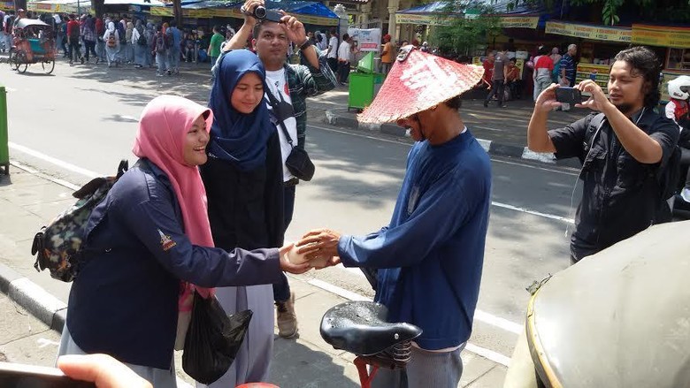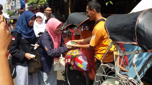 Aksi bagi-bagi nasi bungkus dan susu kedelai ini dilakukan di sejumlah titik, seperti di Jalan Malioboro, Parkir Abubakar Ali, Parkir Ngabean,Pasar Kotagede, Titik Nol Kilometer, dan lain-lain, Sabtu (7/5/2016). Sasaran pembagian adalah tukang becak, andong, pedagang kaki lima dan masyarakat lainnya.